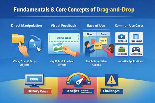 Drag-and-drop is a fundamental interaction technique that allows users to move digital objects across a screen using a pointer or touch input, often controlled with a mouse or alternative keyboard navigation. The concept is based on direct manipulation, where users interact with elements visually instead of typing commands. This approach became widely recognized in the 1980s, following research at Xerox PARC (California, USA), where scientists explored ways to make computing more accessible. One of the key contributors to this vision was Alan Kay, who believed computers should be intuitive tools for everyday people. Drag-and-drop simplifies complex operations such as file management, layout design, and content organization into a single motion. Instead of navigating menus, users can perform actions instantly by dragging items to a target location. Over time, this interaction became a standard feature in operating systems, web applications, and mobile platforms such as Windows, Linux, and MacOS. Today, it is deeply integrated into modern user interface systems and advanced GUI environments. Its success lies in its ability to mirror real-world actions in a digital environment.